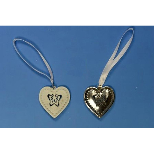 Metallinen sydänriipus. Riipuksessa koristeena perhoskuvio. Myyntierässä on antiikinvalkoinen ja kiiltävä malli. Soveltuu esimerkiksi lahjapakentointiin koristeeksi paketin päälle.