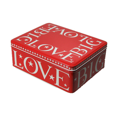 Pirteä peltirasia, jossa kuviointina on isot sanat ”BIG LOVE” ja valkoisia tähtiä somisteena. Kuvioinnin pohjaväri on punainen.
