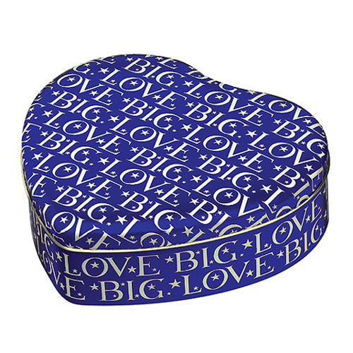 Tilava sydämemmallinen peltirasia, joka on kauttaaltaan kuvioitu tähdillä ja ”BIG LOVE” -sanoilla. Kuvioinnin pohjaväri on sininen.