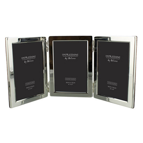 Tyylikäs peruskehys kolmelle valokuvalle. Sopivan leveä (16 mm) hopeoitu reuna antaa kehykselle ilmettä. Hopeoitu ja suojalakattu tummunisen estämiseksi.