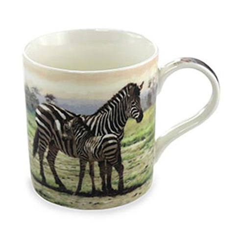 Laadukkaan mukin kuvituksena seepra ja varsa savannilla.
