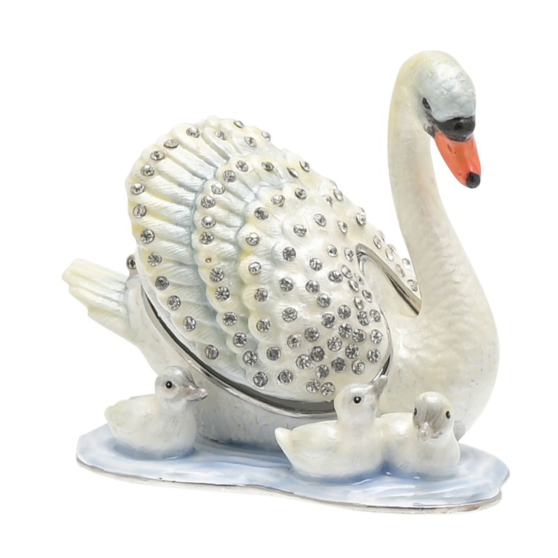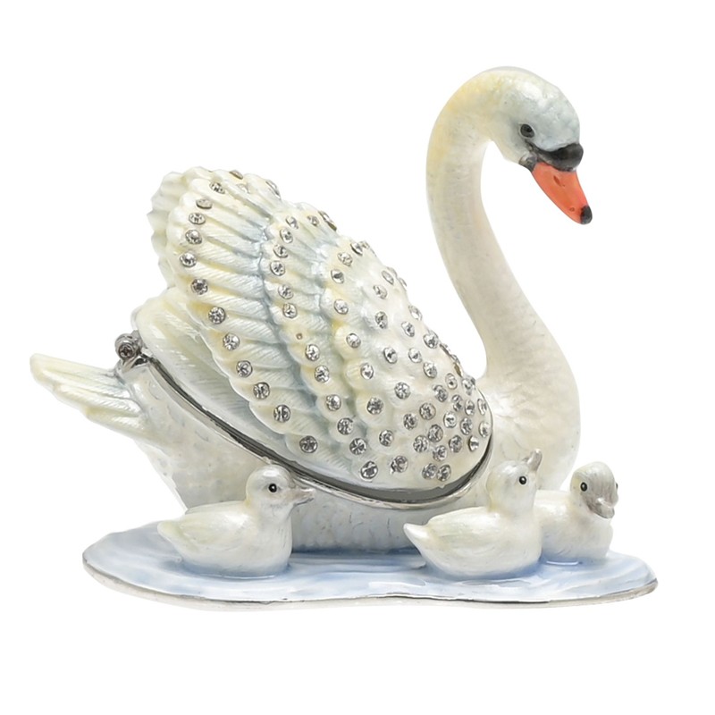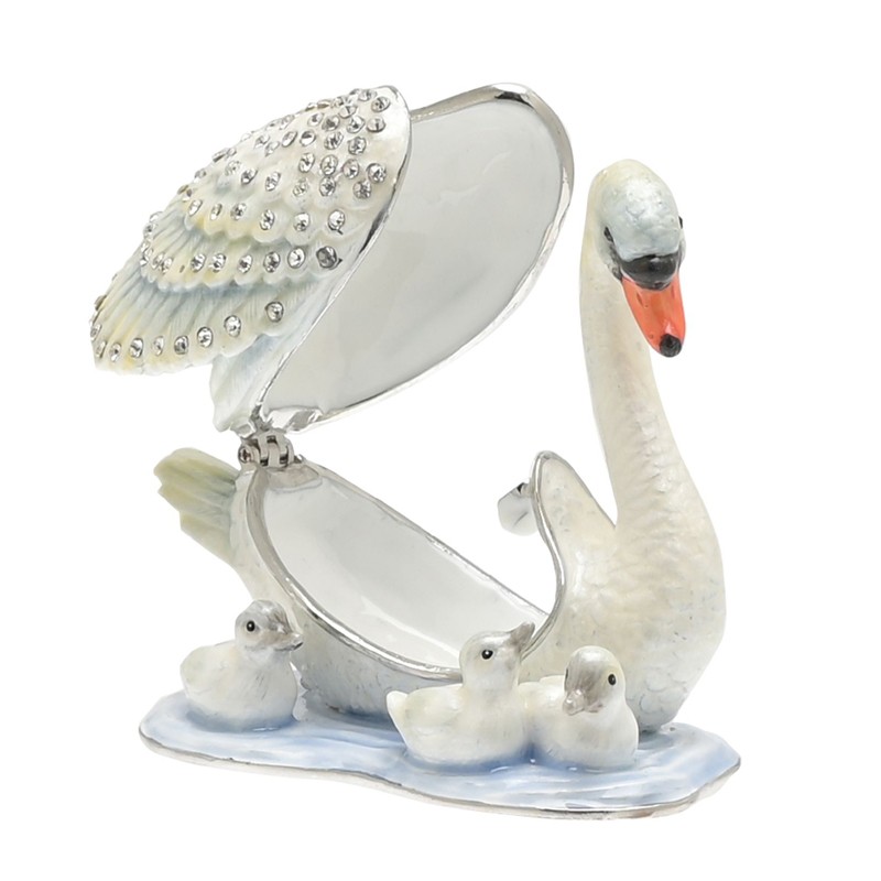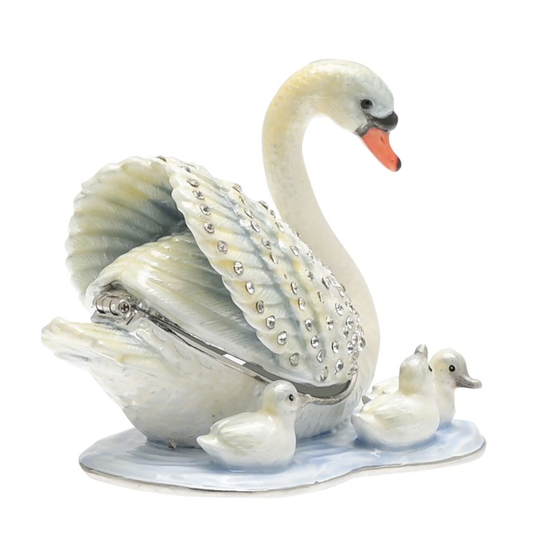 Emali/kultarasia, jossa kauttaaltaan emaloitu joutsen on koristeltu zirkontimantein ja rasian reunat ovat kullattu. Joutsenen ympärillä on kolme poikasta. Rasian sisäpinta on myös kauttaaltaan emaloitu.