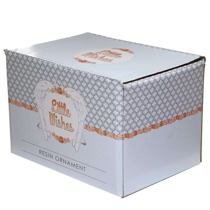 Valkoinen enkeli, jonka siipien suojassa on paikat kolmelle lämpökynttilälle. Tuikut ovat valmiina lasisessa suojakupissa.