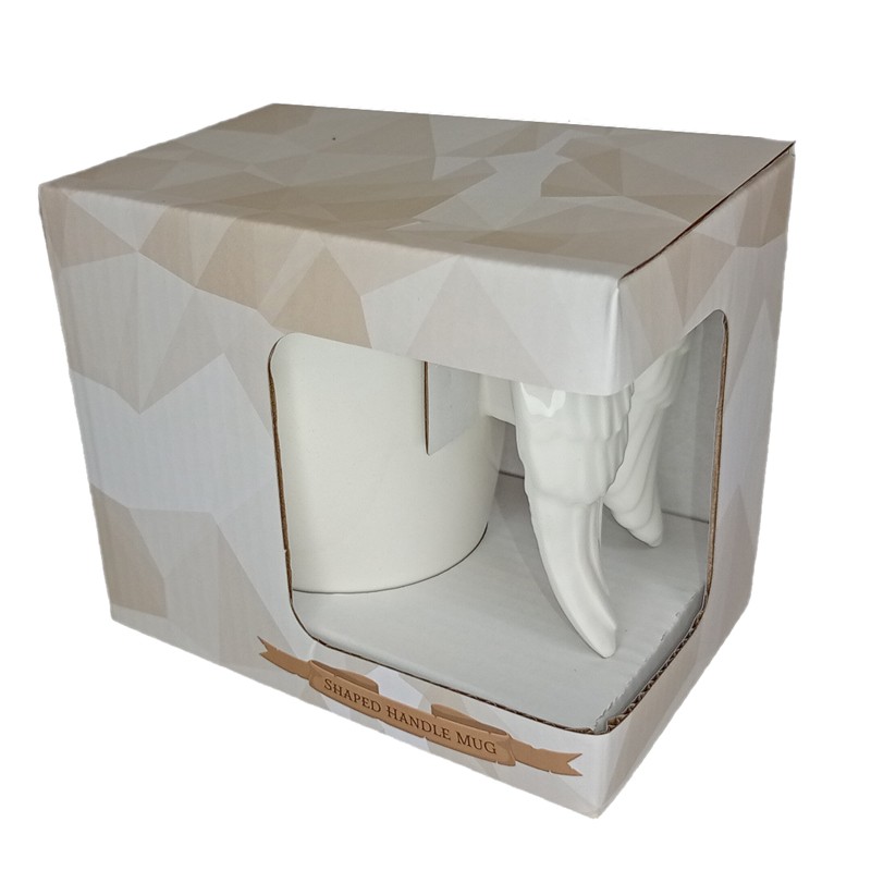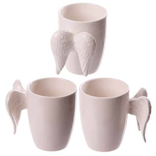 Lasitettu keraaminen muki, jonka kahvana toimii enkelin siivet.