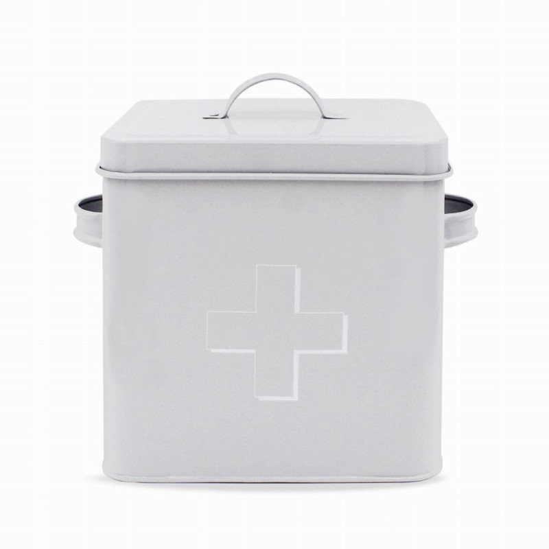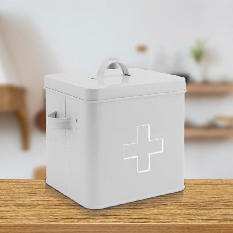 Peltinen ensiaputarvikkeiden säilytyslaatikko. Helppo pitää tavarat järjestyksessä.