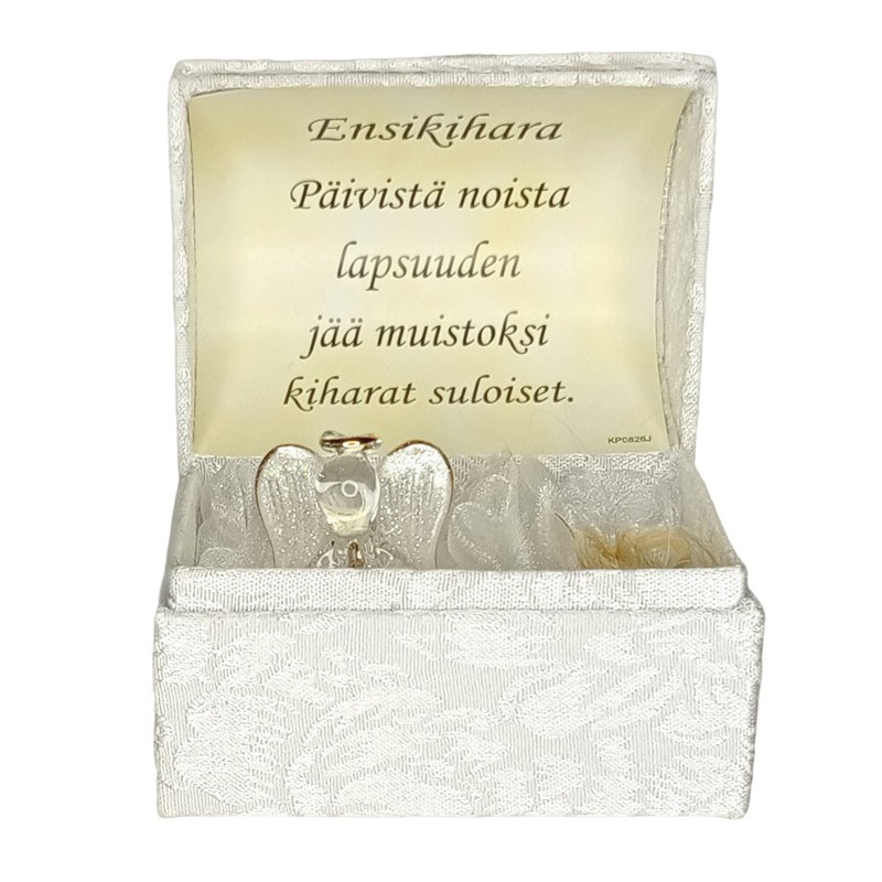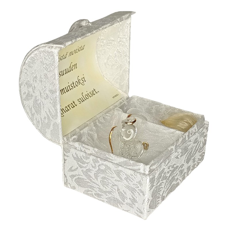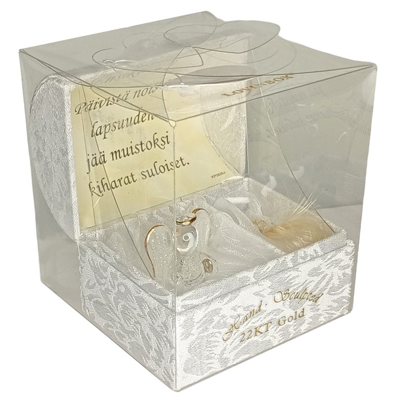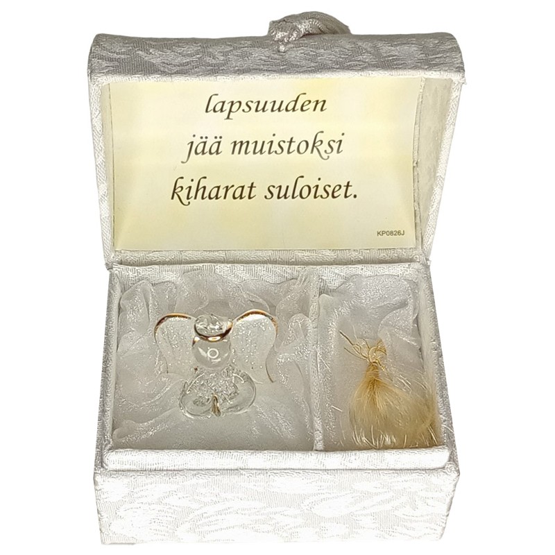 Laadukas ja kaunis lahja! 22 karaatin kultauksin koristeltu lasinen enkeli kankaalla päällystetyssä aarrearkkurasiassa, jossa paikka ensikiharalle. Läpinäkyvä lahjapakkaus.