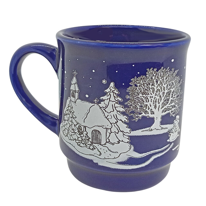 Aito Glühwein -muki Saksasta. Kuvituksena talvinen metsä-/kirkkomaisema.