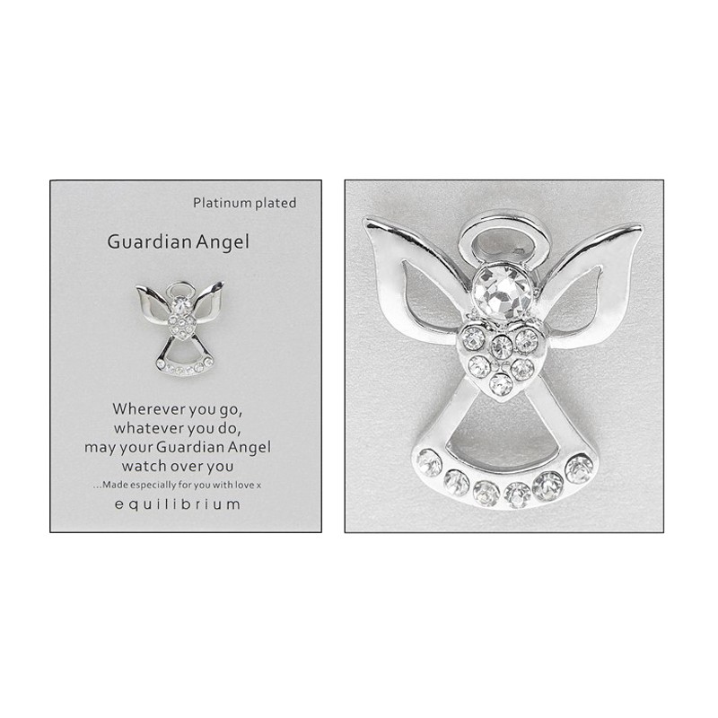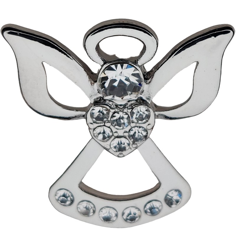 Enkelipinssi on hopeoitu ja siinä on koristeina useita pieniä zirkon-kiviä. Taustapahvissa on englanninkielinen runo.