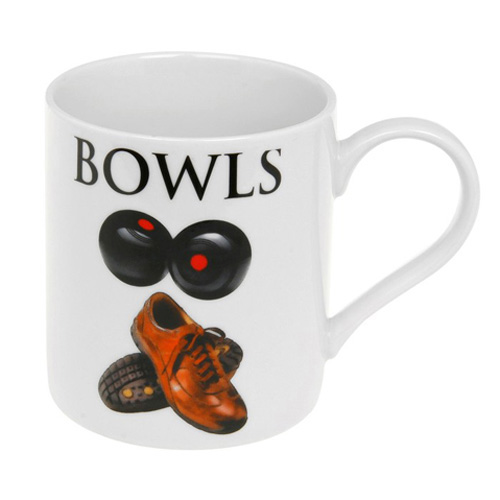 Mukissa teksti: Bowls ja kuva keilapalloista ja keilailukengistä. Kuvat ja teksti mukin molemmilla puolilla.