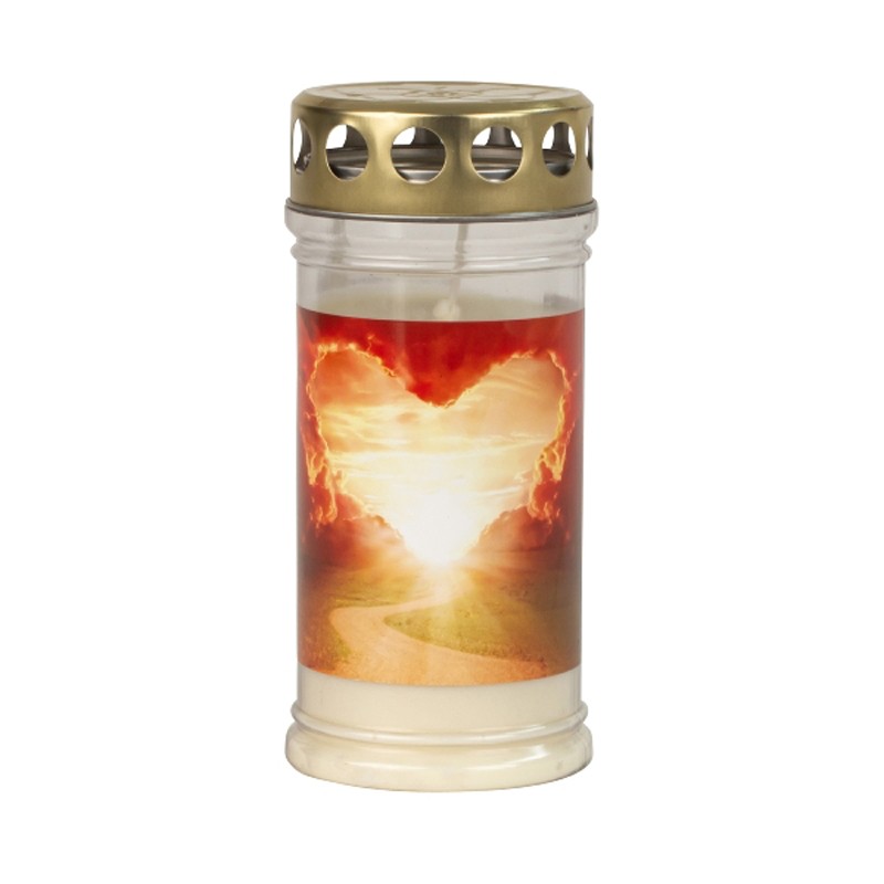 Turvallinen suurikokoinen hautakynttilä. Kaunis sydänkuvio.