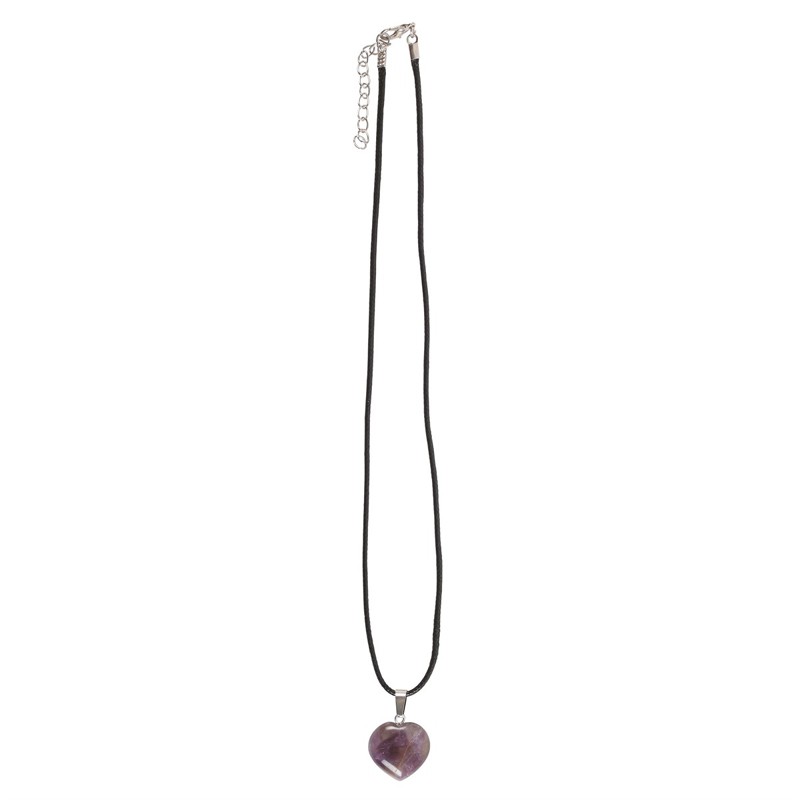 Ametistikivestä valmistettu sydämenmuotoinen kaulakoru. Punottu kaulanauha, säädettävä pituus.