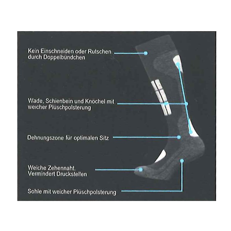 Nämä polvisukat sopivat ihanteellisesti kaikkiin talviurheilulajeihin. Erittäin korkea käyttömukavuus sisäänrakennettujen vaimennus- ja joustoalueiden ansiosta. Pehmeästi pehmustetut suojat sääressä, pohkeessa ja jalkapöydässä. Litteä varvassauma estää hankaumia ja hiertymiä kovassakin käytössä. Paksu muhkea pohja vaimentaa optimaalisesti iskuja. Integroidut ”AIR CHANNELIT” pohjassa takaavat optimaalisen ilmastoinnin jopa pitkiä päiviä luonnossa. Miellyttävästi lämmittävä ilman hikoilua.