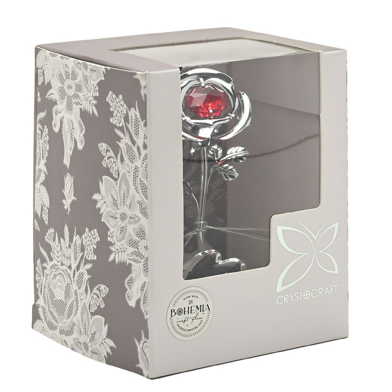 Kaunis tummanpunainen kristalli. Kukan terälehdet, varsi ja jalusta on hopeoitu. Kukan varressa on teksti ”I Love You”.