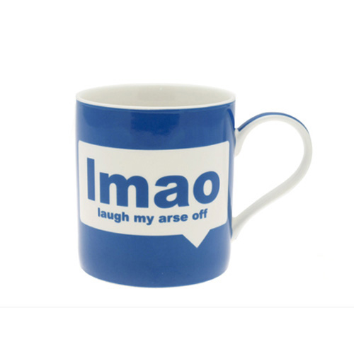 Tasokasta posliinia oleva muki, jossa tekstiviesti ”LMAO – laugh my arse off”
