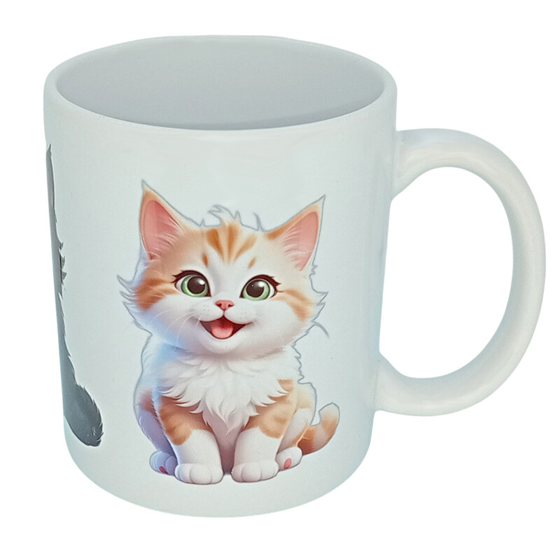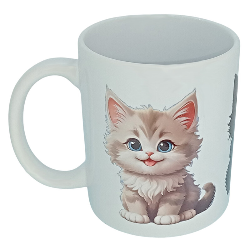 Tasokas posliinimuki, jossa on iloisia kissanpennun kuvia.