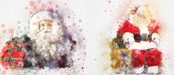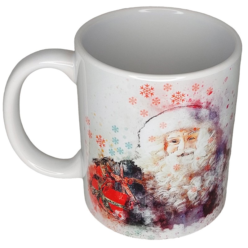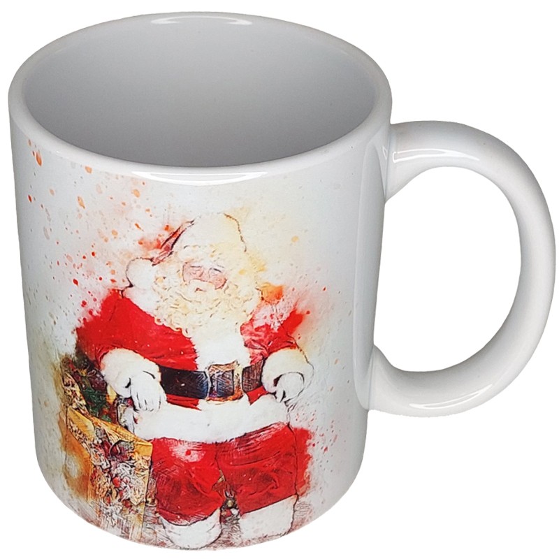 Tosi jouluinen joulupukki. Mukin eri puolilla on eri kuva.