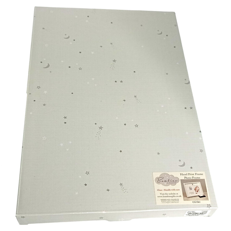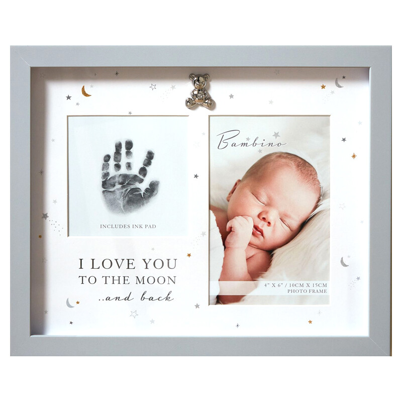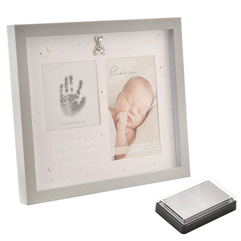 Ikuista pienokaisen käden- tai jalanjälki kehykseen. Paina lapsen jalan tai kädenjälki pakkauksen mukana tulevalle pahville mustetyynyn avulla. Kehyksessä on paikka painojälkiarkille ja yhdelle valokuvalle. Hopeoitu nallekoriste, jossa zirkon-timantti. Erinomainen kastelahja. Pakkauksessa on mukana mustetyyny, painoarkkia ja suomen- ja englanninkieliset käyttöohjeet.