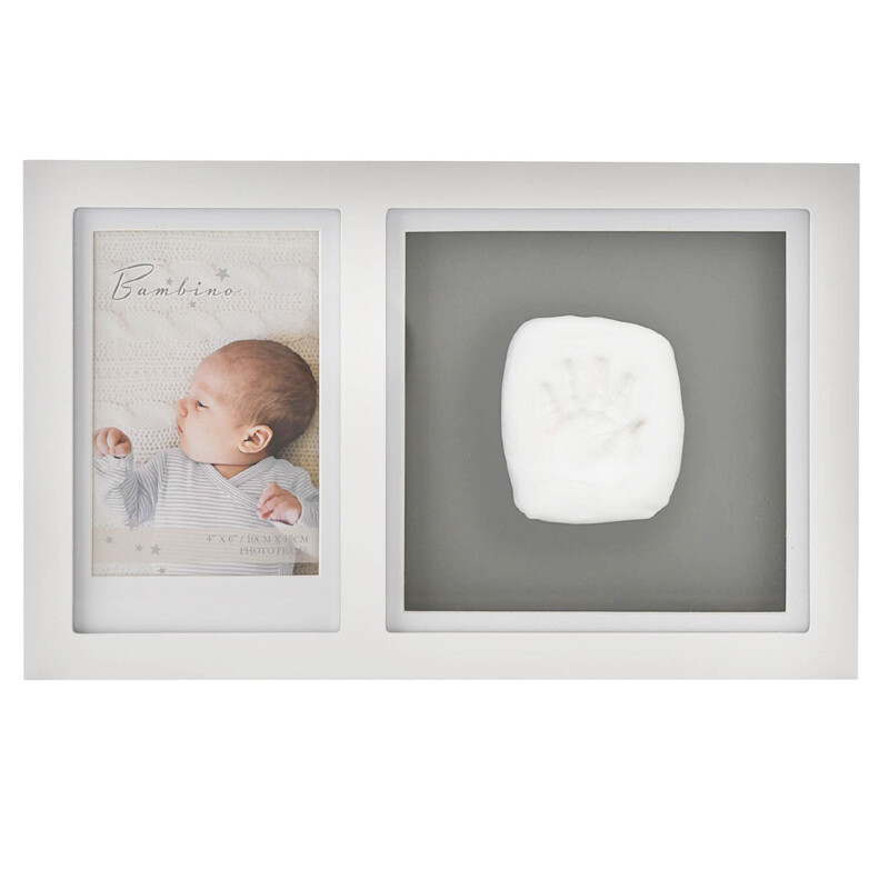 Kehyksessä on paikka kipsijäljelle ja valokuvalle. Erinomainen kastelahja.