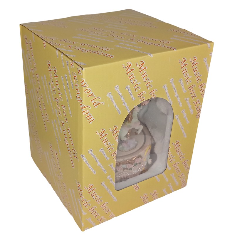 Karuselli-soittorasia, jossa kolmen hevosen karuselli pyörii ympäri musiikin soidessa. Karusellin keskipylväs, katoksen ja alustan reunat koristeltu ruusuin. Yleisväri on punertavan beige.