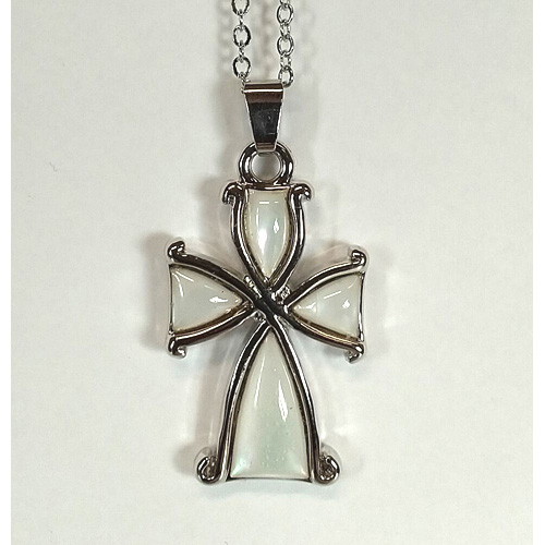 Tämä kaunis kaulakoru on tehty vaaleansävyisestä Paua-simpukan kuoresta. Korun runko on hopeoitua korumetallia.