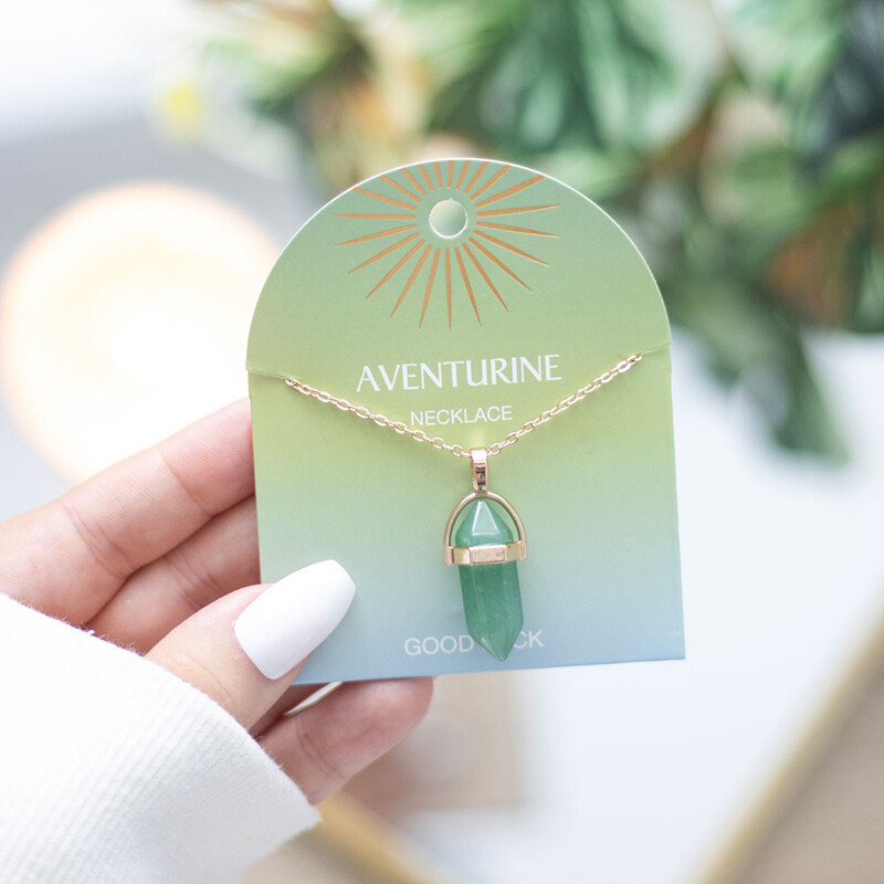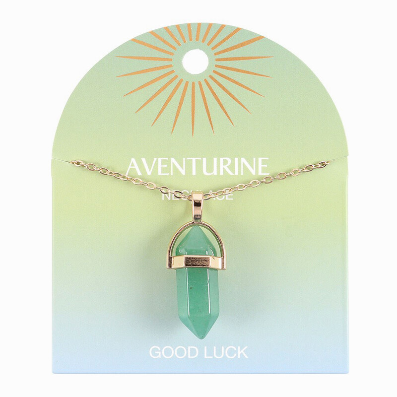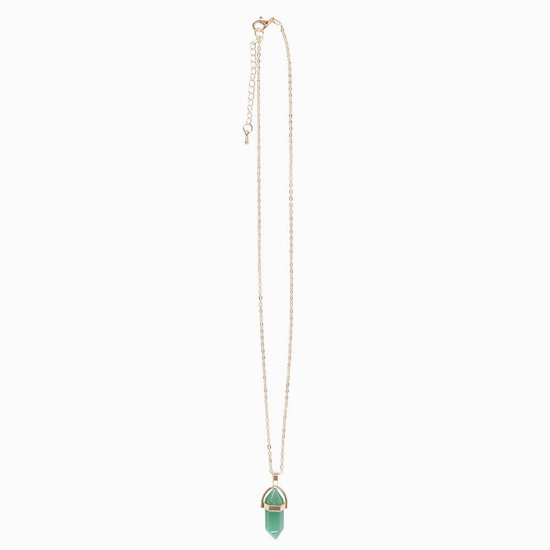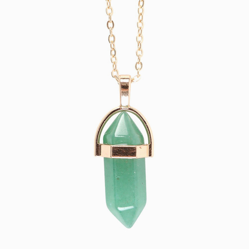 Aventuriini -kvartsista tuplaobeliskinmuotoon hiottu koru. Metalliosat ovat ruostumatonta terästä.