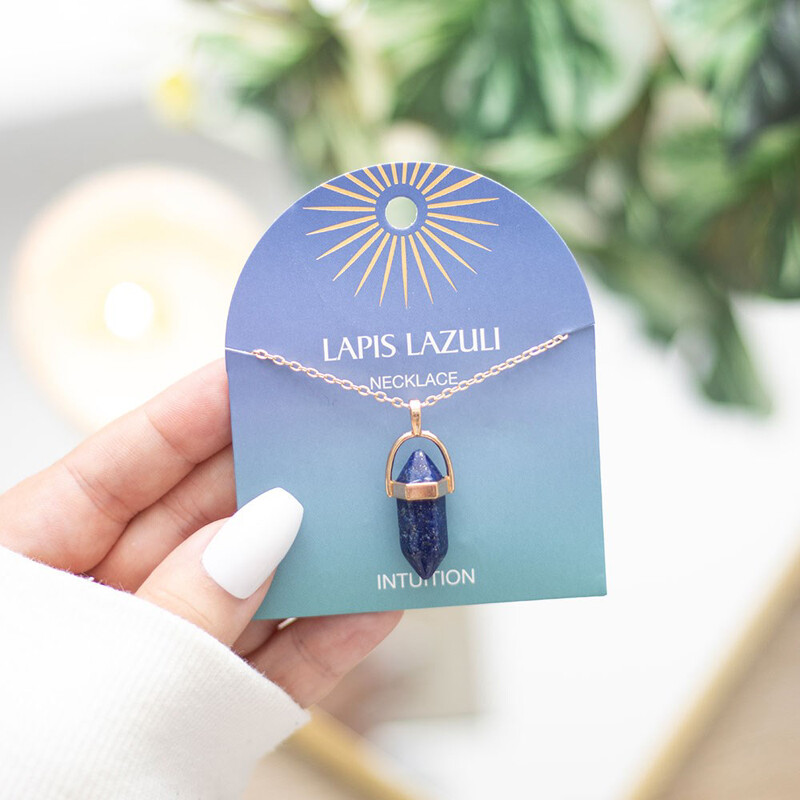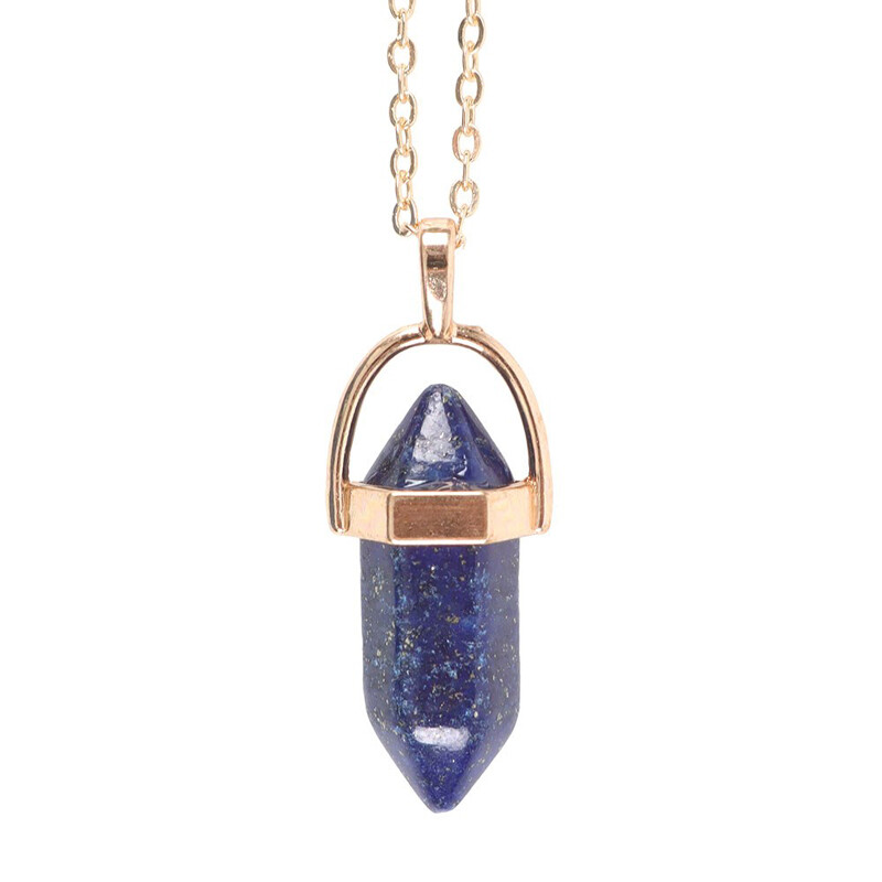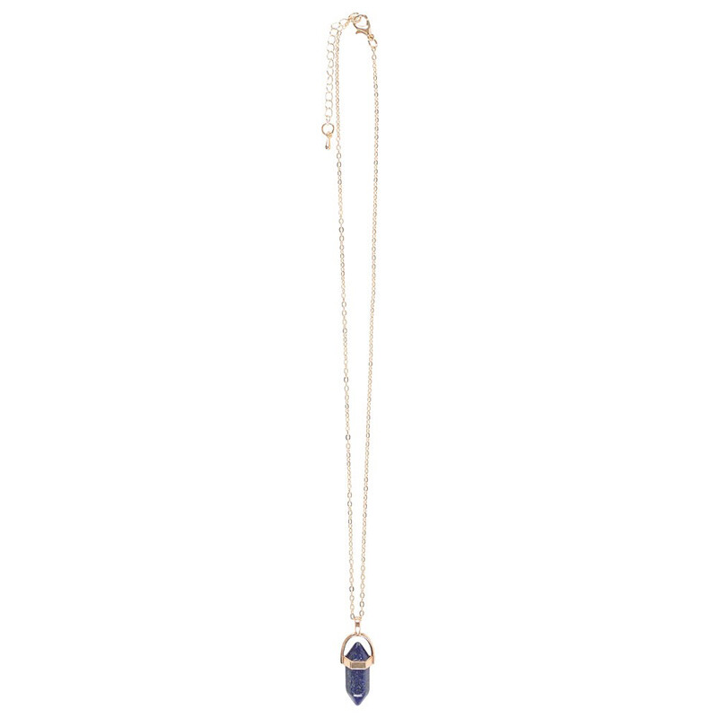Lapis Lazuli -kvartsista tuplaobeliskinmuotoon hiottu koru. Metalliosat ovat ruostumatonta terästä.