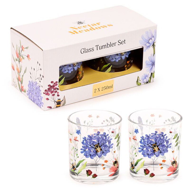 Kaksi juomalasia suositulla kesäkukat -kuviolla. Hinta on pakkauksen eli kahden lasin yhteishinta.