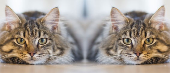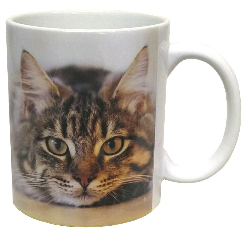 Tasokas posliinimuki, jossa mukin molemmilla puolilla on harmaaraitaisen kissan kuva.
