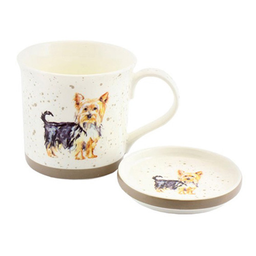 Erittäin laadukas muki, jossa on kaksi akvarellitekniikalla tehtyä maalauksellista yorkshirenterrierin kuvaa. Mukana mukin alunen