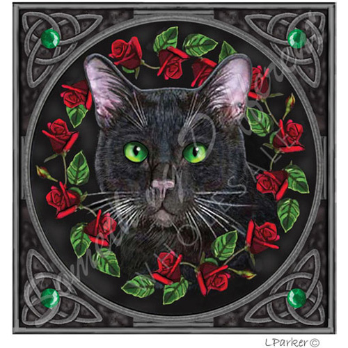 Taitekortti jossa on kuvattuna musta kissa punaisten ruusujen ympäröimänä. Kortissa ei tekstiä.