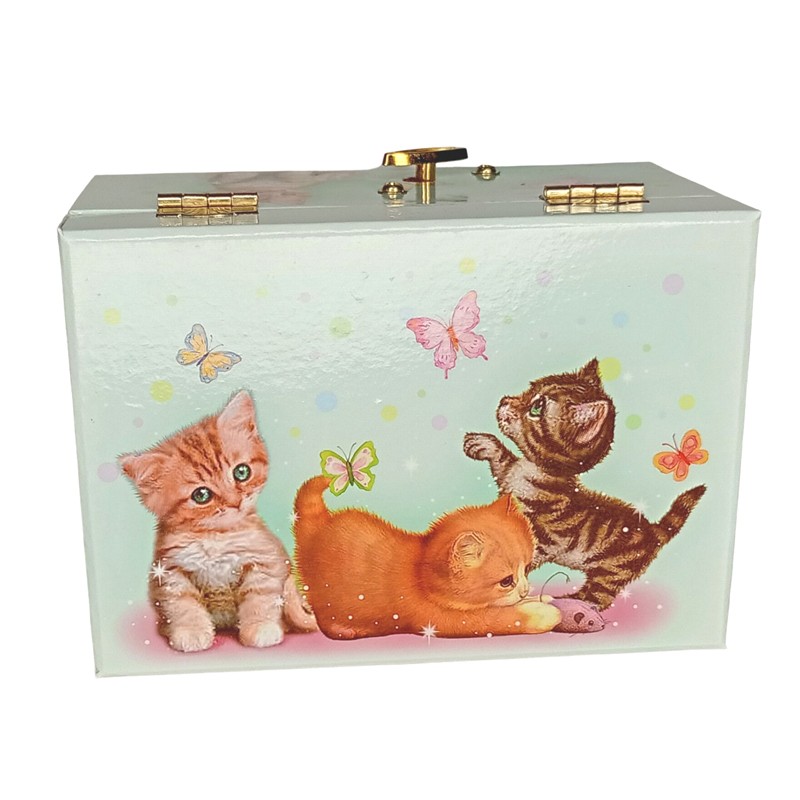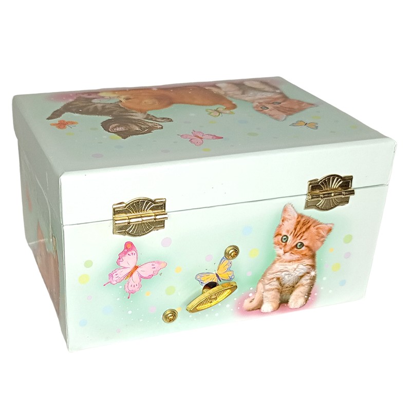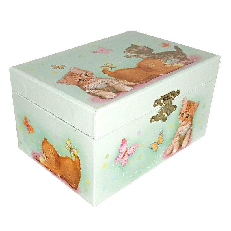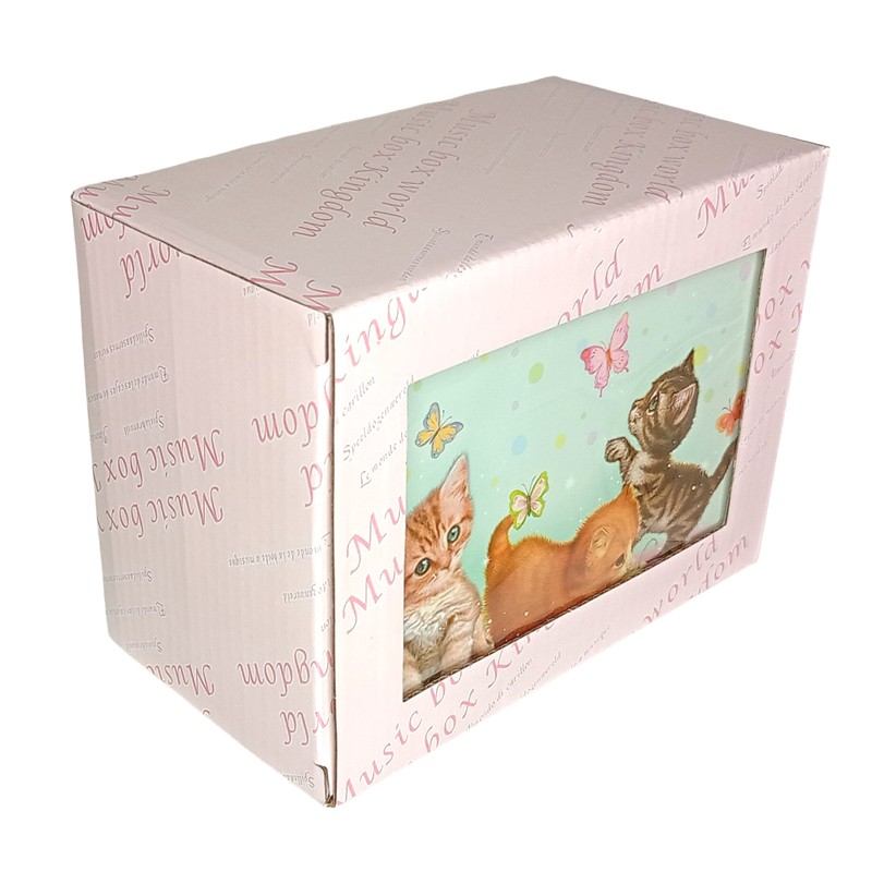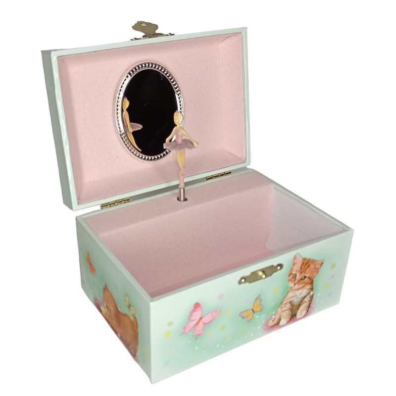 Suloinen soittorasia, jossa päällyskuviointina on leikkisiä kissanpentuja. Sisäpinnoiltaan rasia on päällystetty pinkillä tekstiilillä. Kannen sisäpinnalla on lisäksi 7 cm korkea ovaali peili, jonka edessä ballerina tanssii musiikin soidessa.