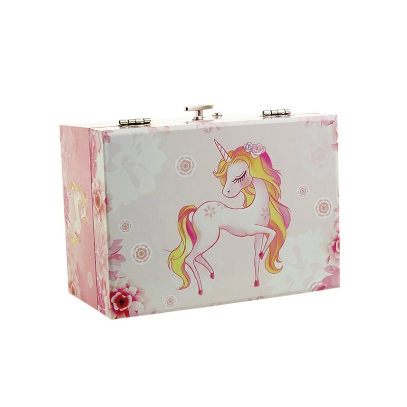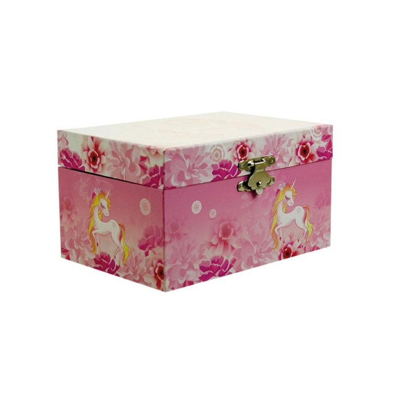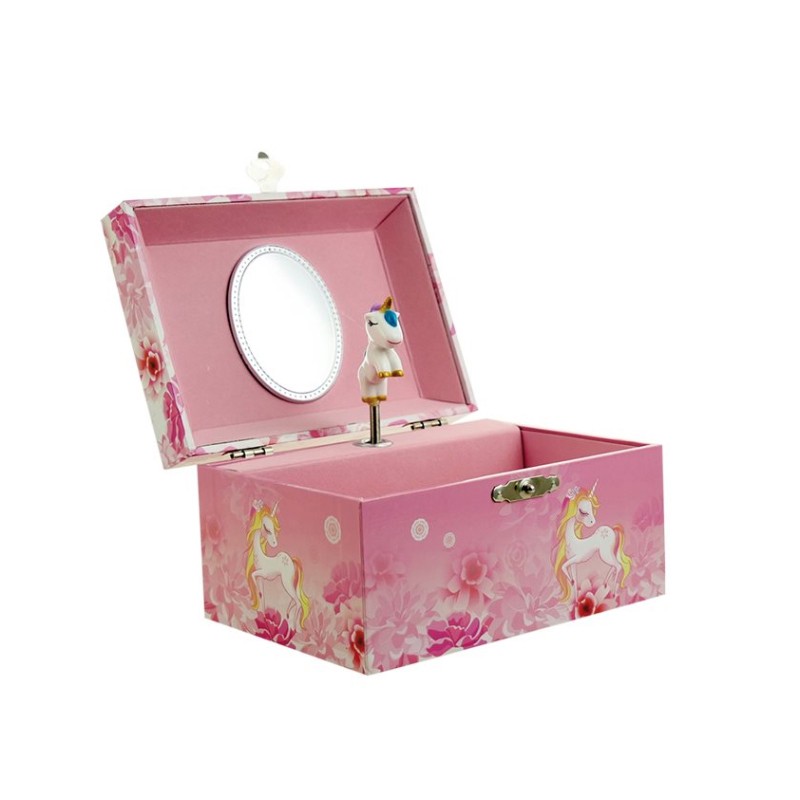 Ihana korurasia/soittorasia, kuvituksena yksisarvisia. Sisäpinnoiltaan rasia on pehmustettu pinkillä tekstiilillä. Kannen sisäpinnalla on 7 cm korkea ovaali peili, jonka edessä yksisarvinen tanssii musiikin soidessa.