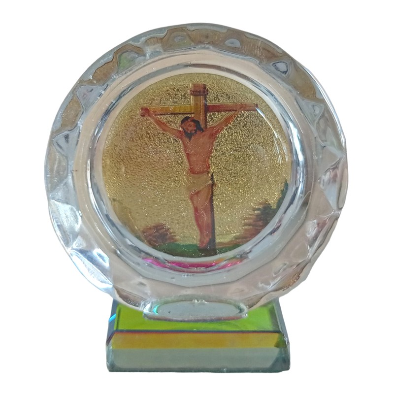 Kullanvärisellä pohjalla on Jeesuksen kuva. Kuva on kiinnitetty kristalliseen ja hiottuun alustaan, joka pysyy omalla alustallaan pystyssä.