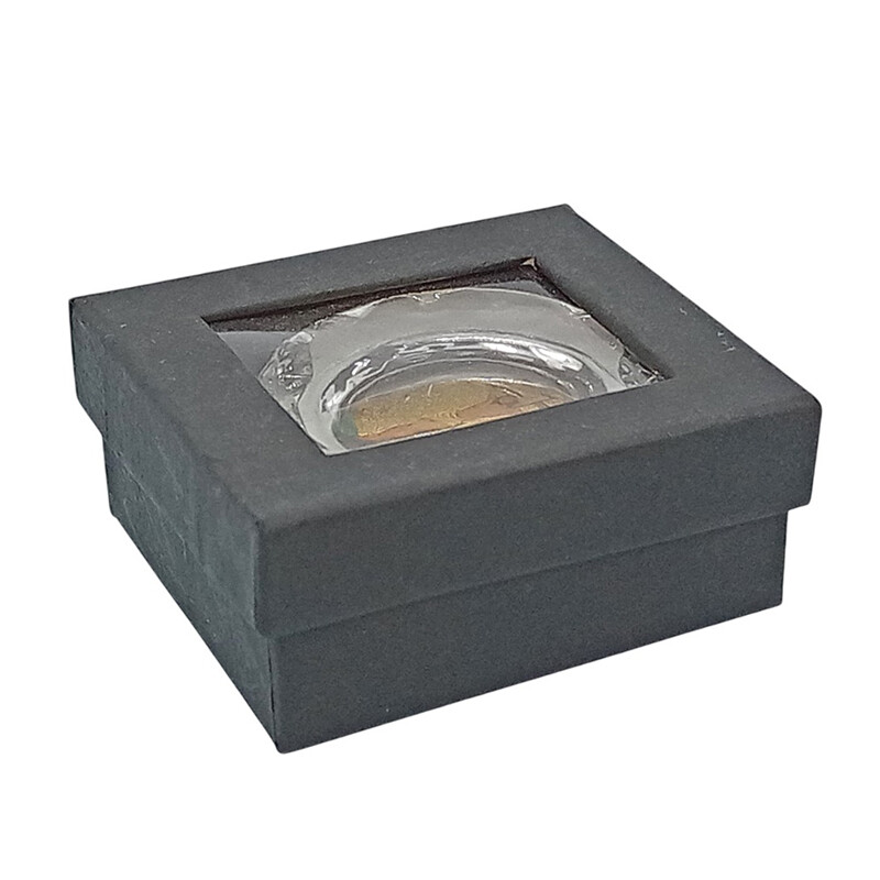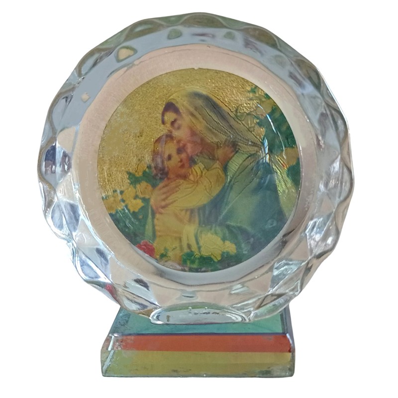 Vihreä/kultasävyinen kuva Mariasta ja Jeesuslapsesta. Kuva on kiinnitetty kristalliseen ja hiottuun alustaan, joka pysyy omalla alustallaan pystyssä.