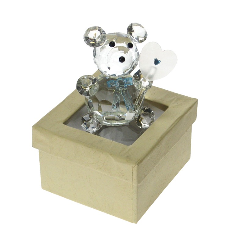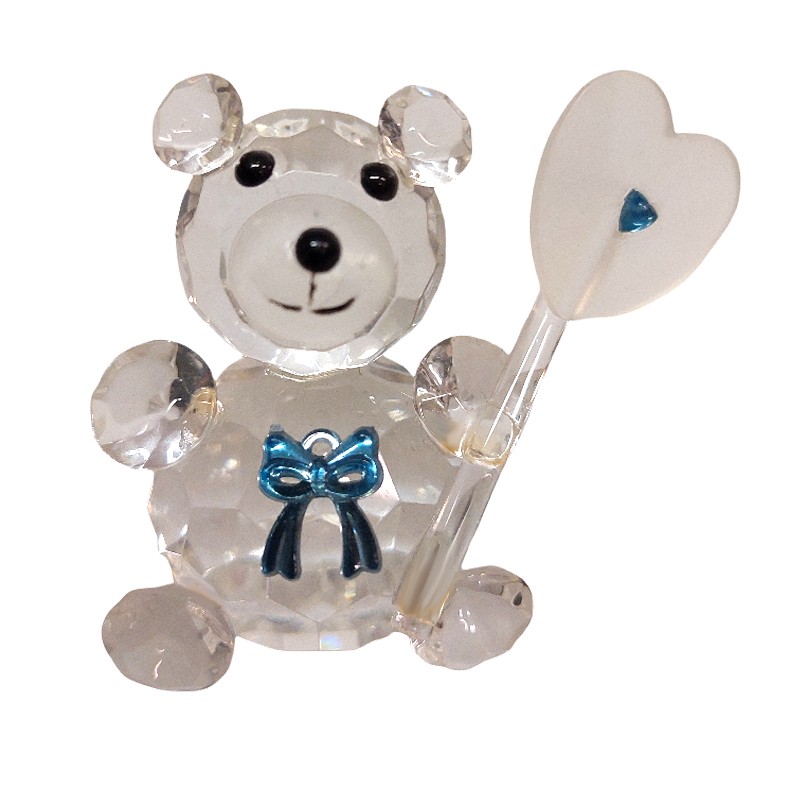 Suloinen kristallinalle. Nalle pitelee sydämenmuotoista kylttiä, jonka keskellä pieni sininen lasisydän. Nallen kaulassa oleva rusetti on myös sininen.