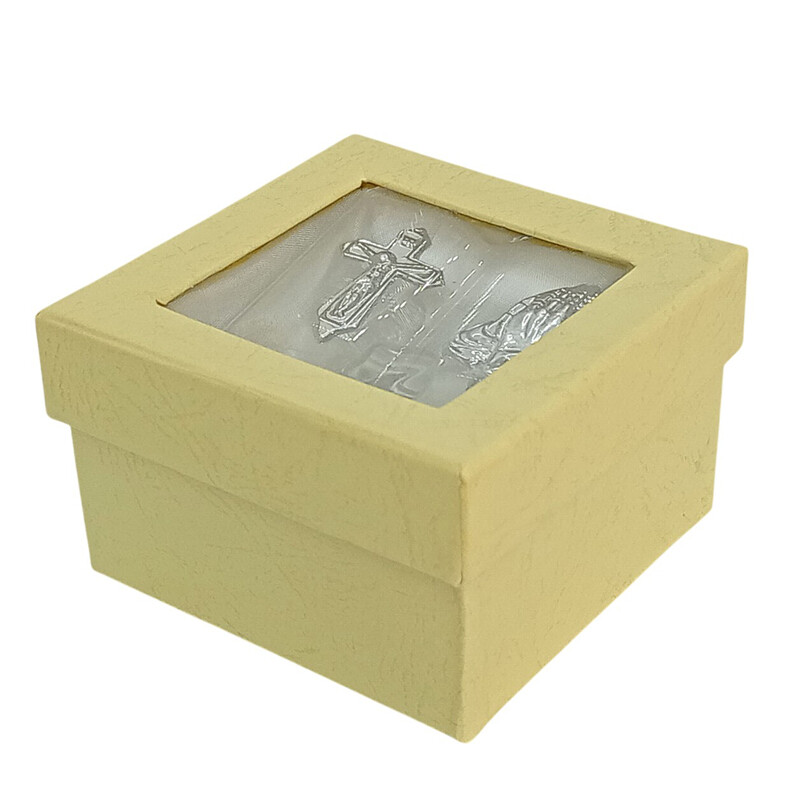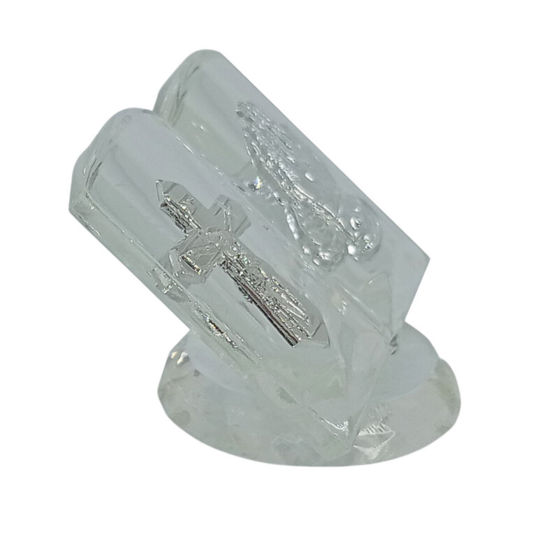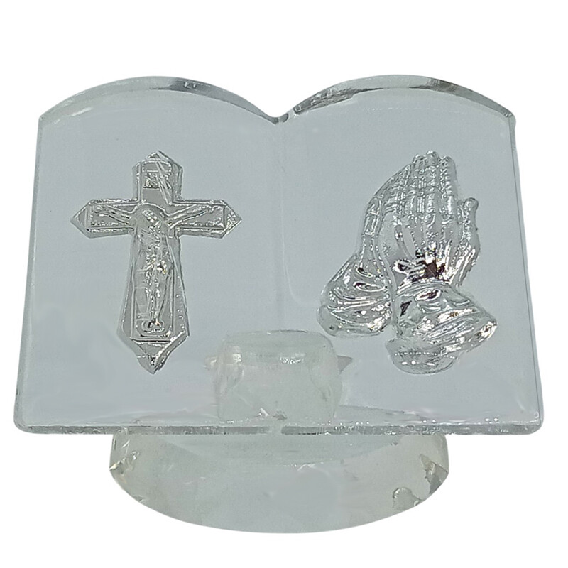 Raamatun muotoiseen lasipaasiin kaiverrettu risti ja kädet. Risti ja kädet on hopeamaalattu. Lasipaasissa on tukeva jalusta.