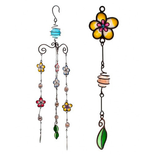 Kauniissa kukkamobilessa monivärisiä tiffanykukkia ja lasisia palloja. Ihana terassille tai vaikka lastenhuoneeseen.