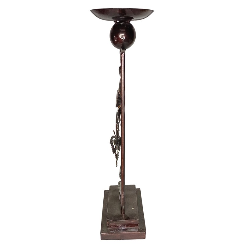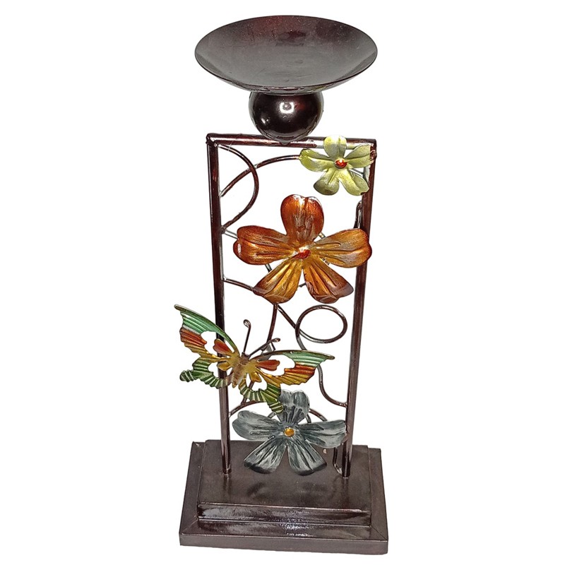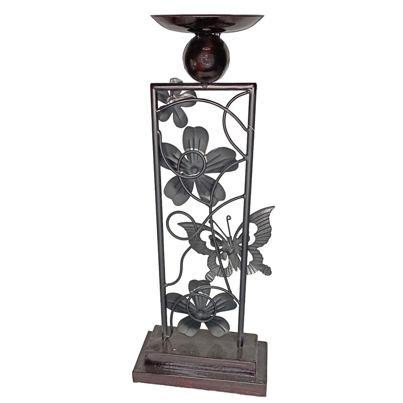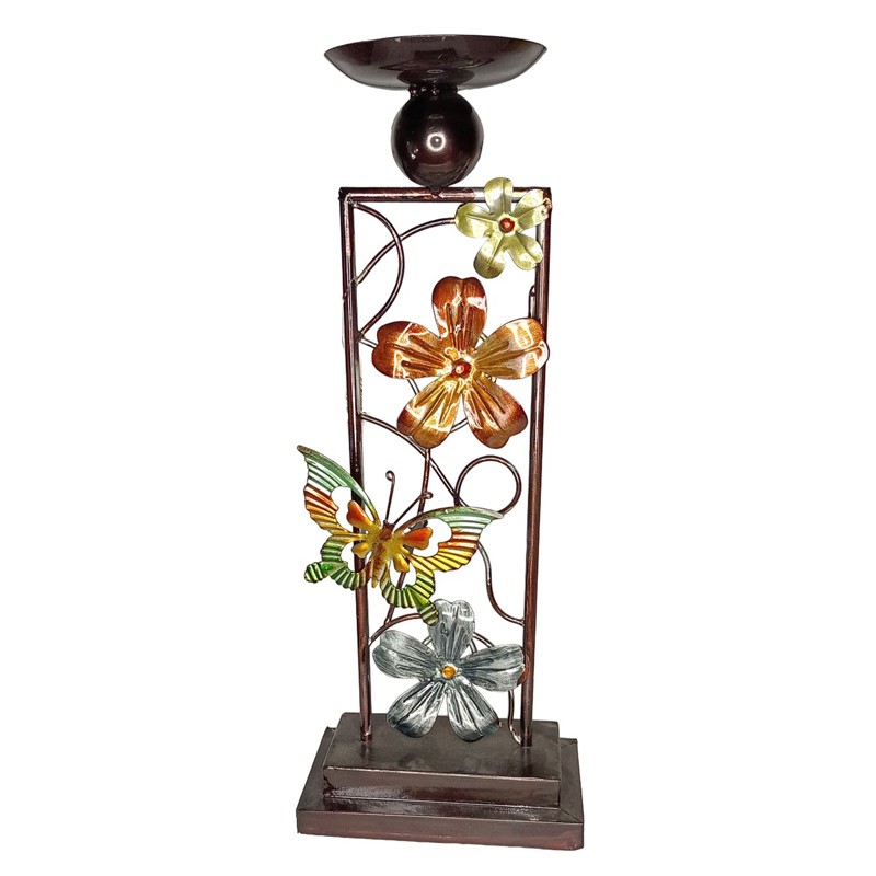 Näyttävä kynttilänjalka, joka on upea koriste ilman kynttilääkin. Metallinen ja kiiltävksi maalattu kukka ja perhoskoristus on somistamassa keskiosaa. Tukeva ja painava alusta pitää tuotteen hyvin pystyssä.