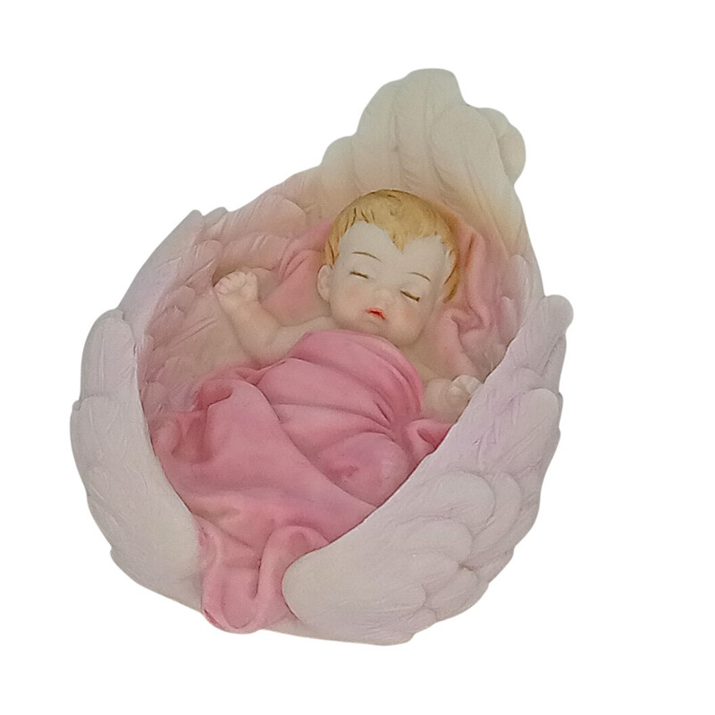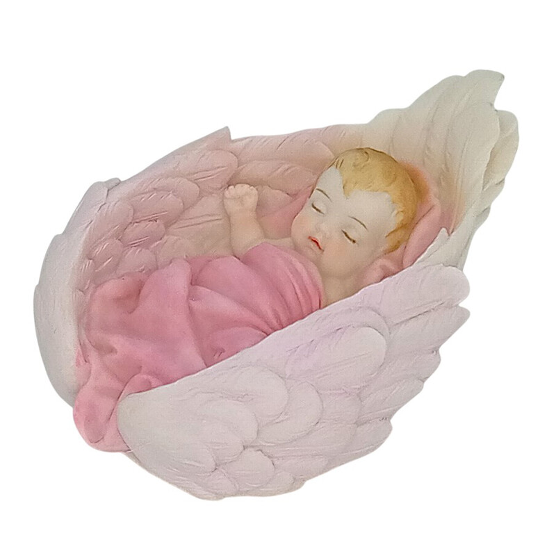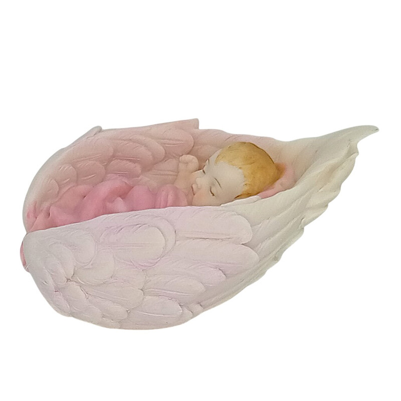 Suloinen vauva nukkuu vaaleanpunaisten enkelin siipien suojassa.