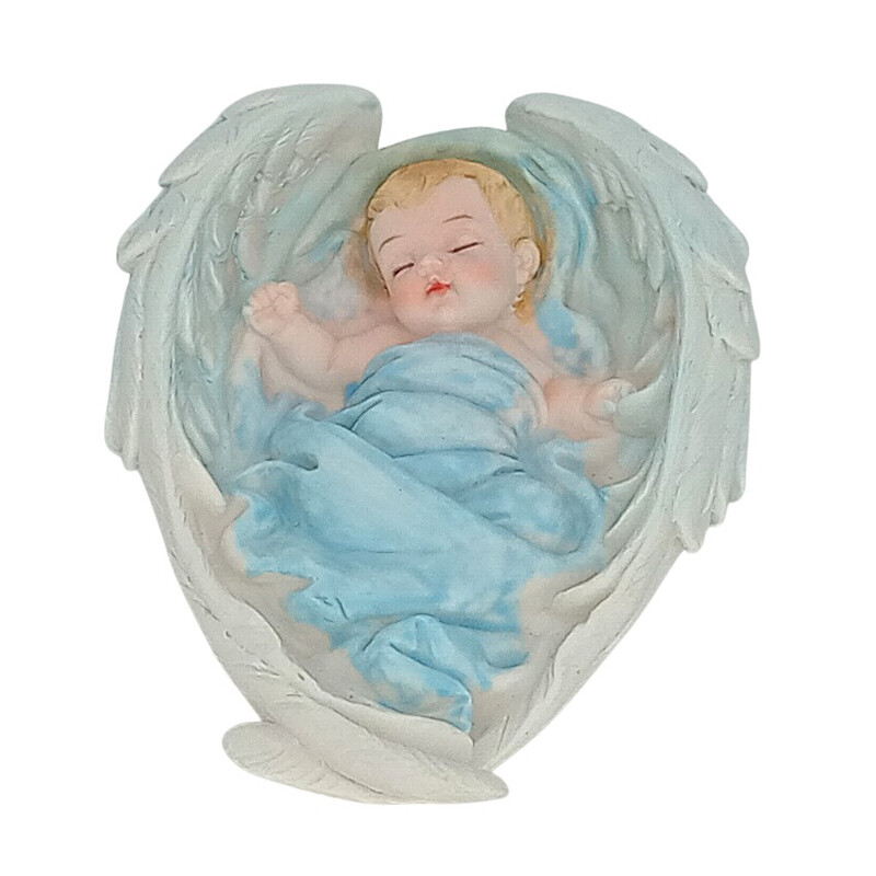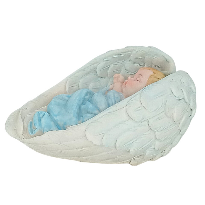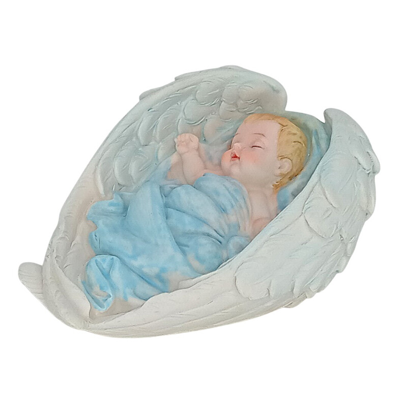 Suloinen vauva nukkuu vaaleansinisten enkelin siipien suojassa.