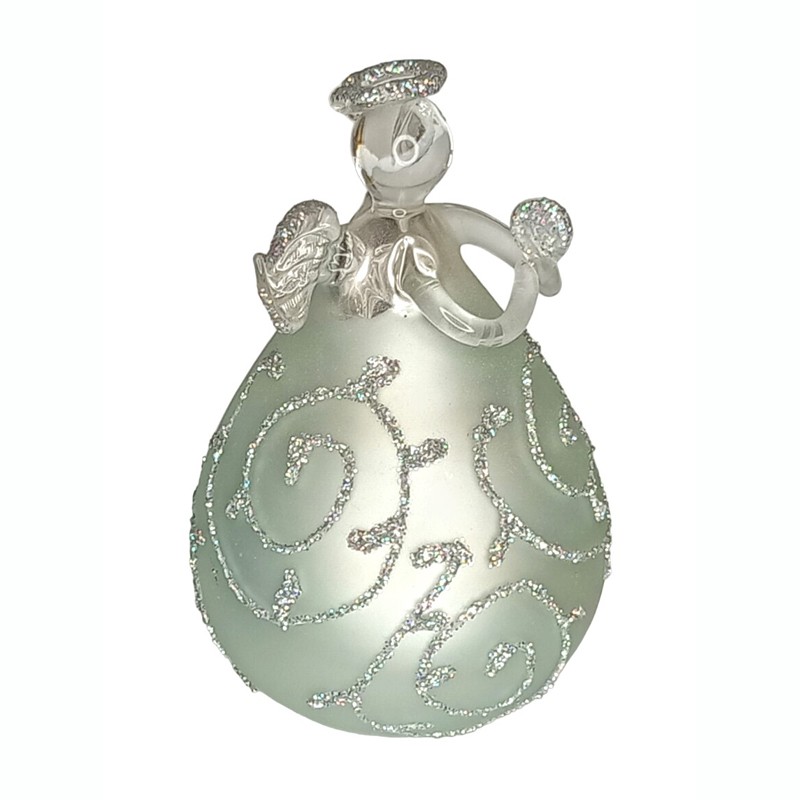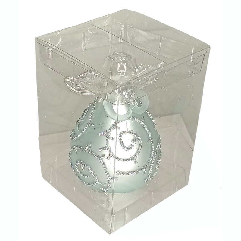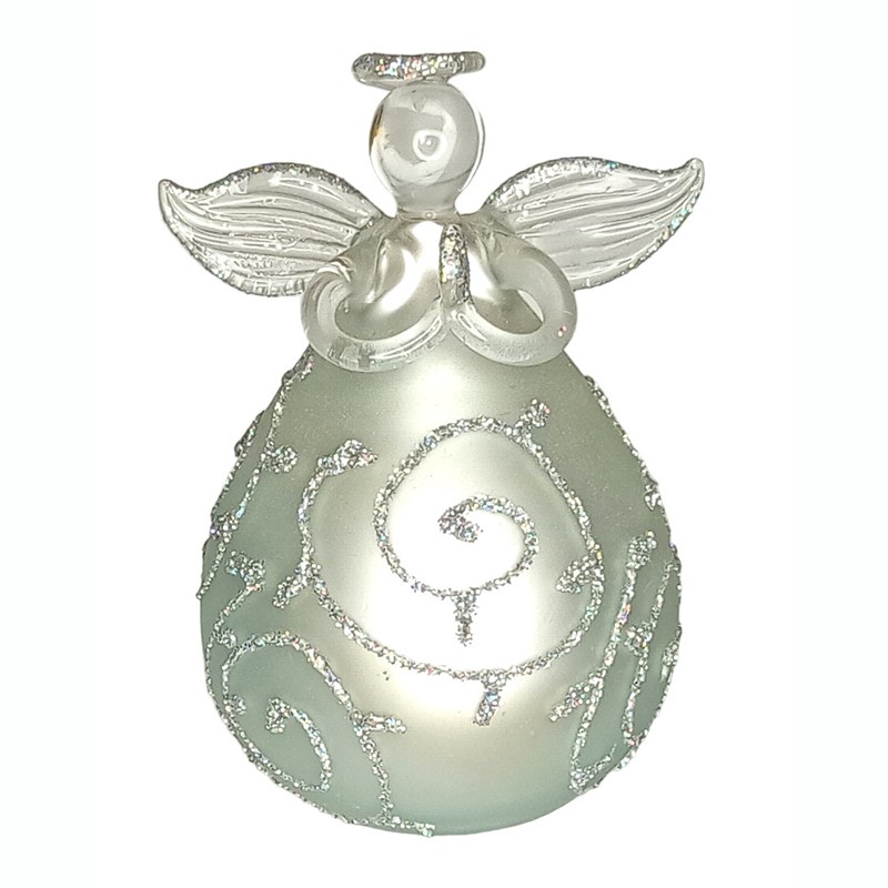 Lasienkeli, vaaleansinisessä helmassa kimallekuvio. Enkelin pohja on tasainen, joten enkeli seisoo pöydällä. Mukana on ripustuslanka, josta enkelin saa riippumaan.