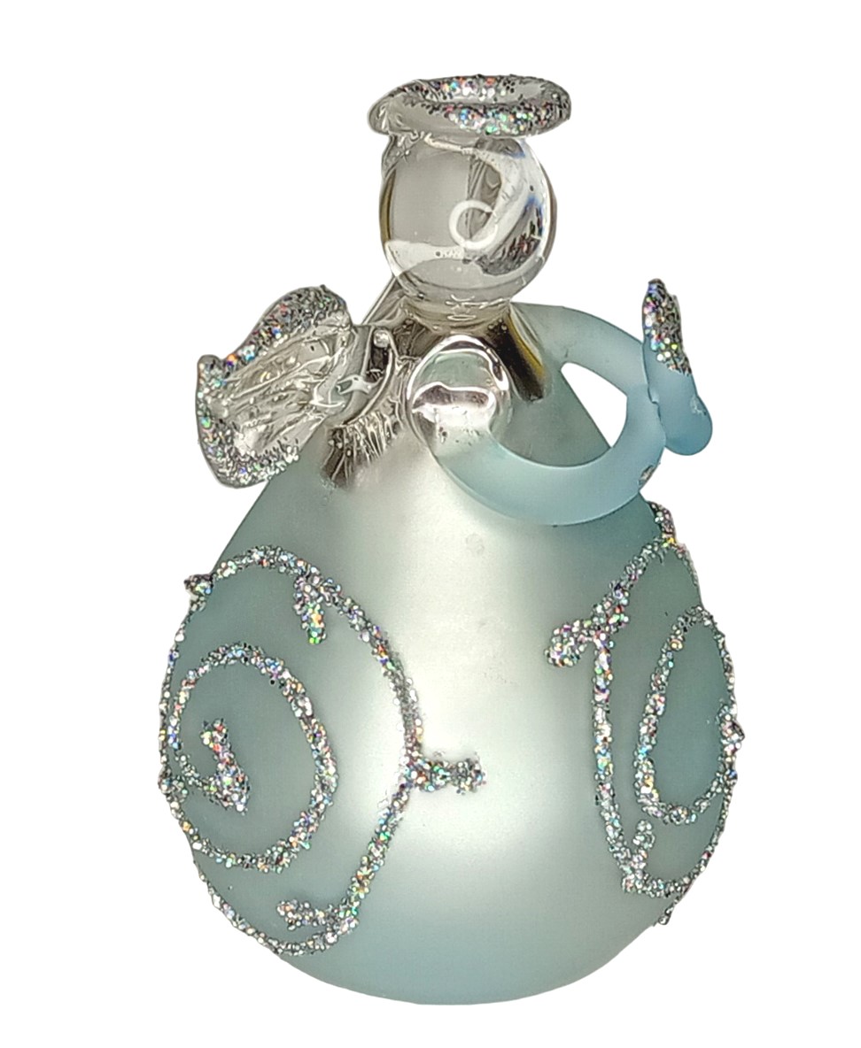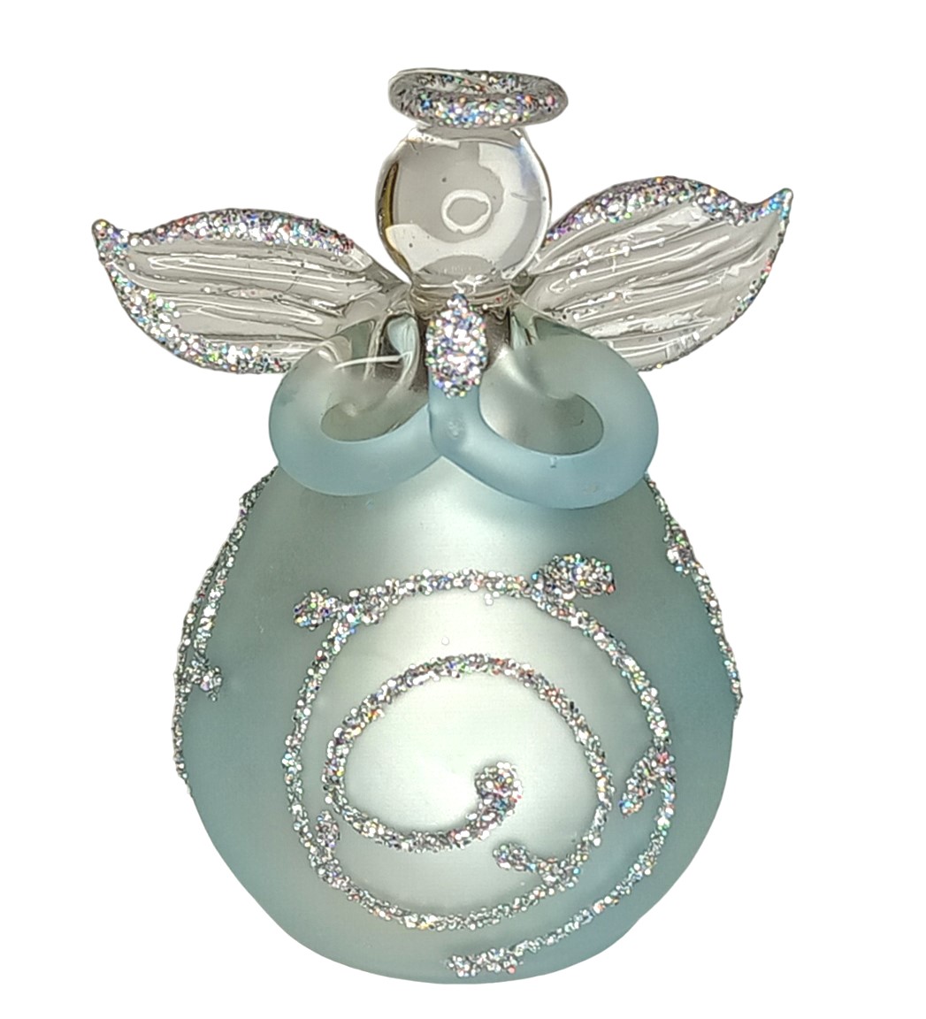 Lasienkeli, jonka helma-osa on sinisävyinen himmeä lasi, jonkä päälle on kirjailtu hilekimalteisia ympyröitä. Mukana on ripustuslanka, josta enkelin saa riippumaan.