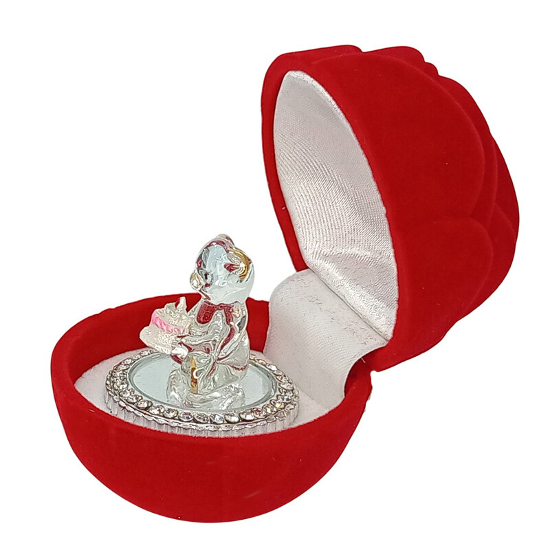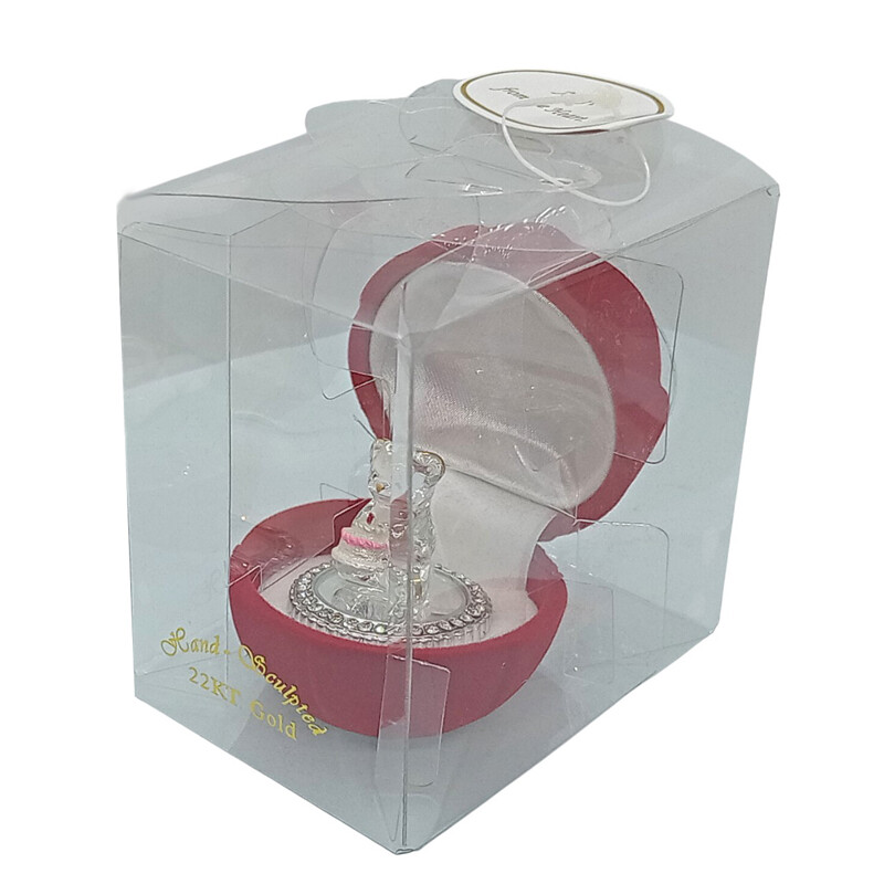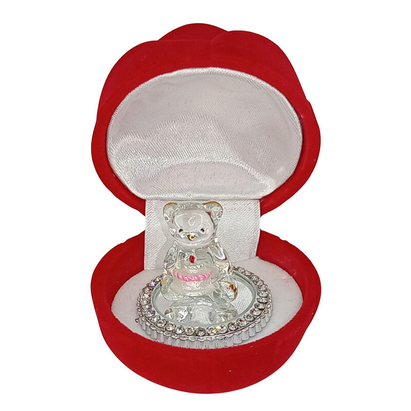 Veikeä lasinalle täytekakku sylissä. Rasia, jossa nalle istuu on ruusunmuotoinen punainen samettirasia saranoilla. Kokonaisuus on vielä pakattu läpinäkyvään ja tukevaan myyntipakkaukseen.