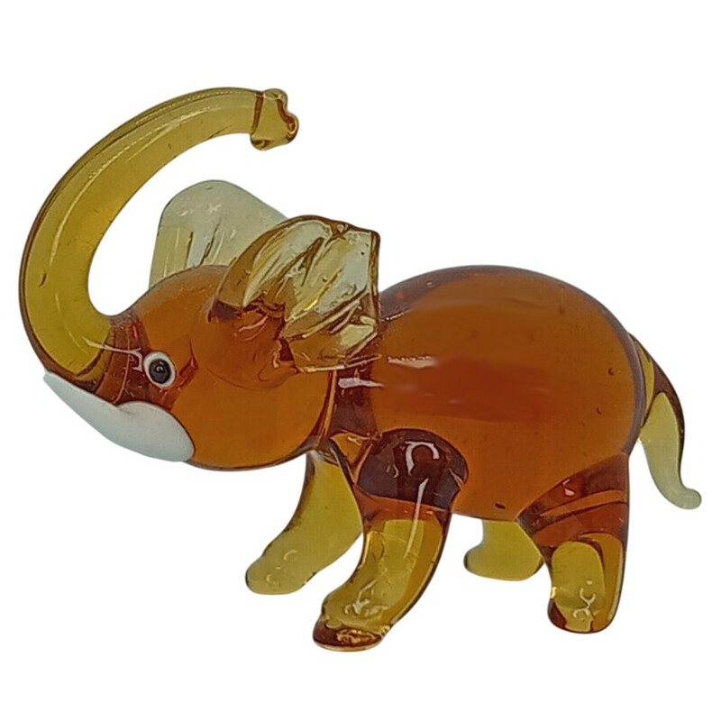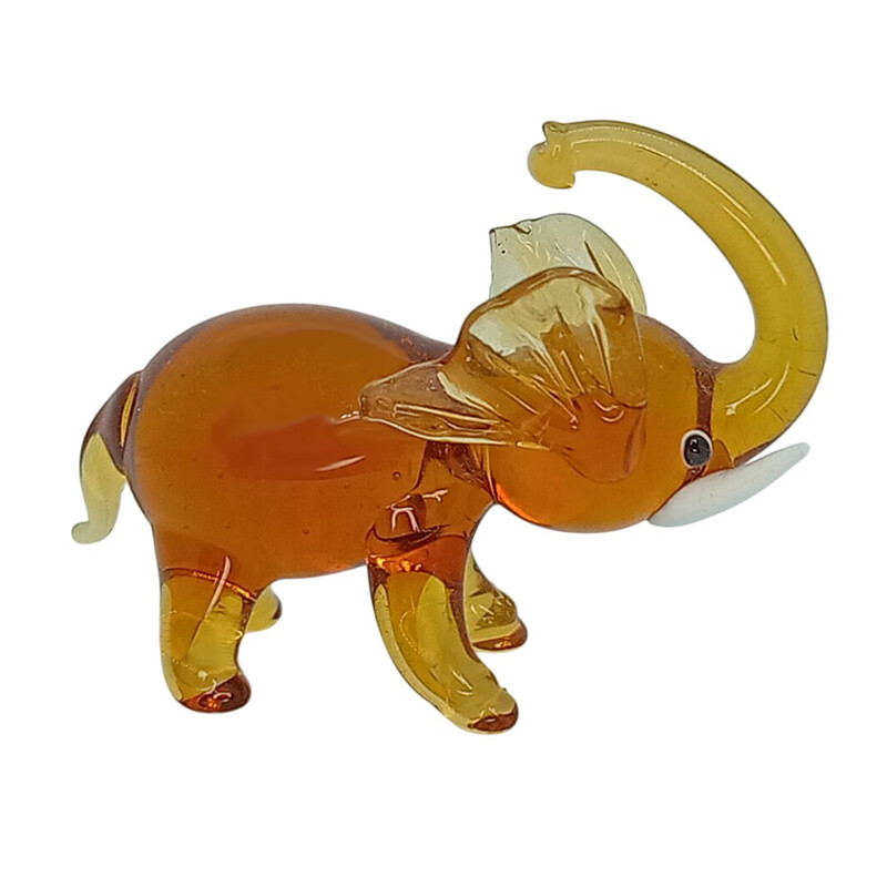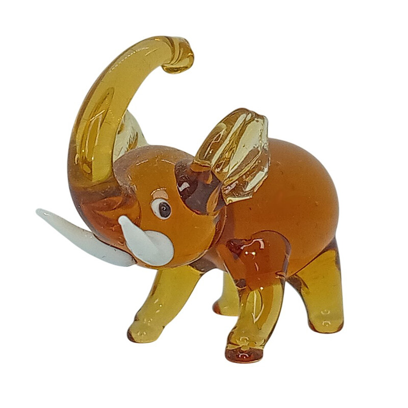 Tämä meripihkanvärinen lasinorsu on onnennorsu, kärsä korkealla ilmassa. Tuote on yksittäispakattu ikkunalliseen rasiaan.