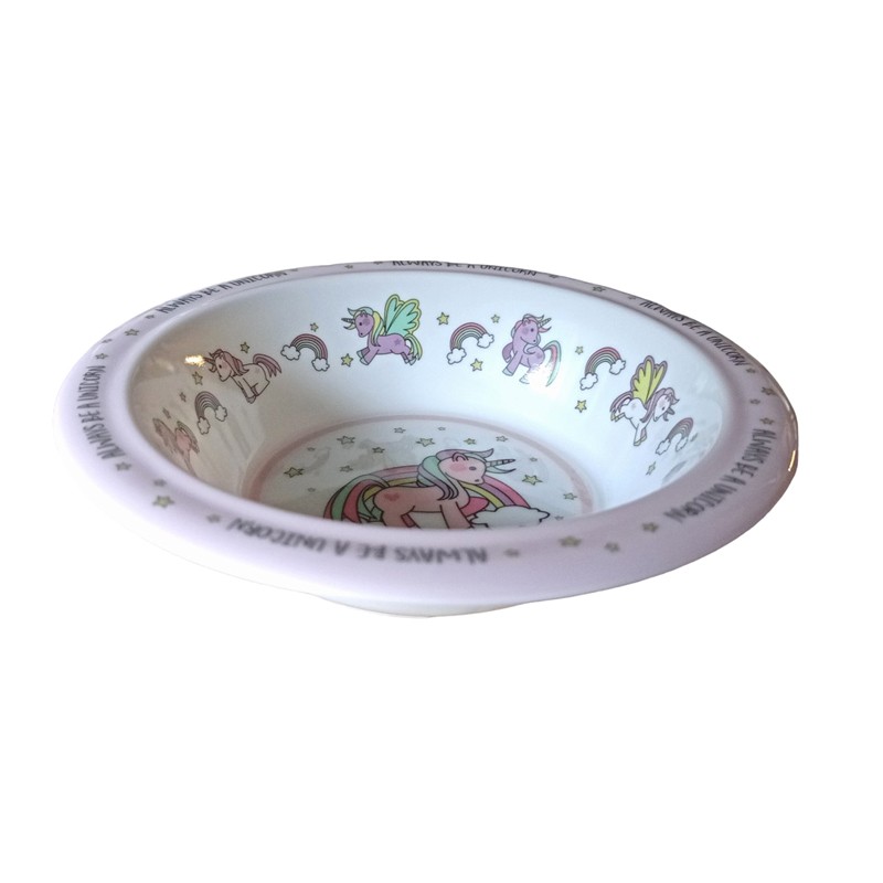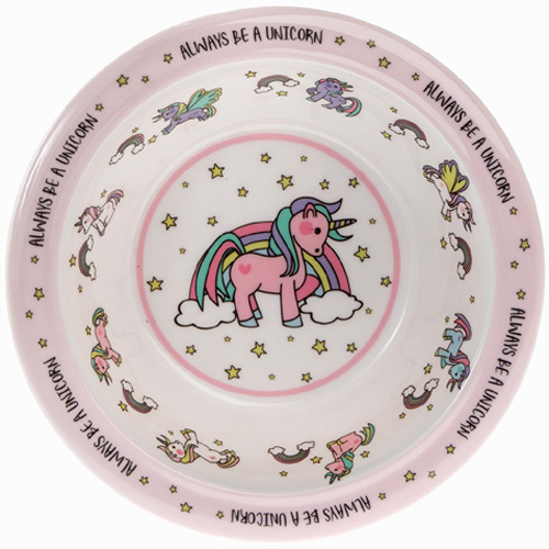 ”Always Be a Unicorn” -syvä lautanen. Lautasessa ihana yksisarviskuvitus.