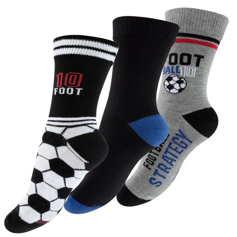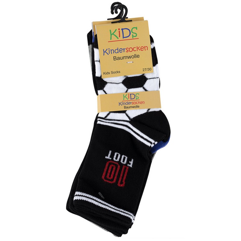 Muodikkaat lasten sukat jalkapallokuvioilla. Mukava ja ihoystävällinen puuvillasekoitesukka. Hengittävyyttä parantava neuletekniikka. Nipussa on kolme erilaista sukkaparia.