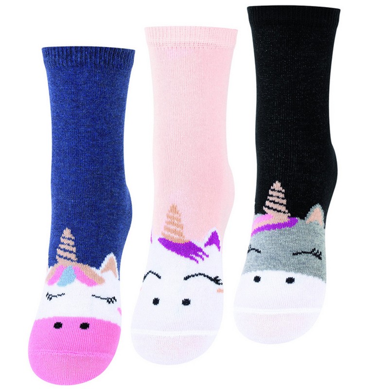 Muodikkaat lasten sukat yksisarvisilla kuvioilla. Mukava ja ihoystävällinen puuvillasekoitesukka. Kiristämätön resori yläreunassa. Nipussa on kolme erilaista sukkaparia.