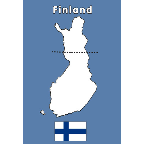 Jääkaappimagneetti jossa on Suomen kartta, lippu ja teksti ”Finland”.
