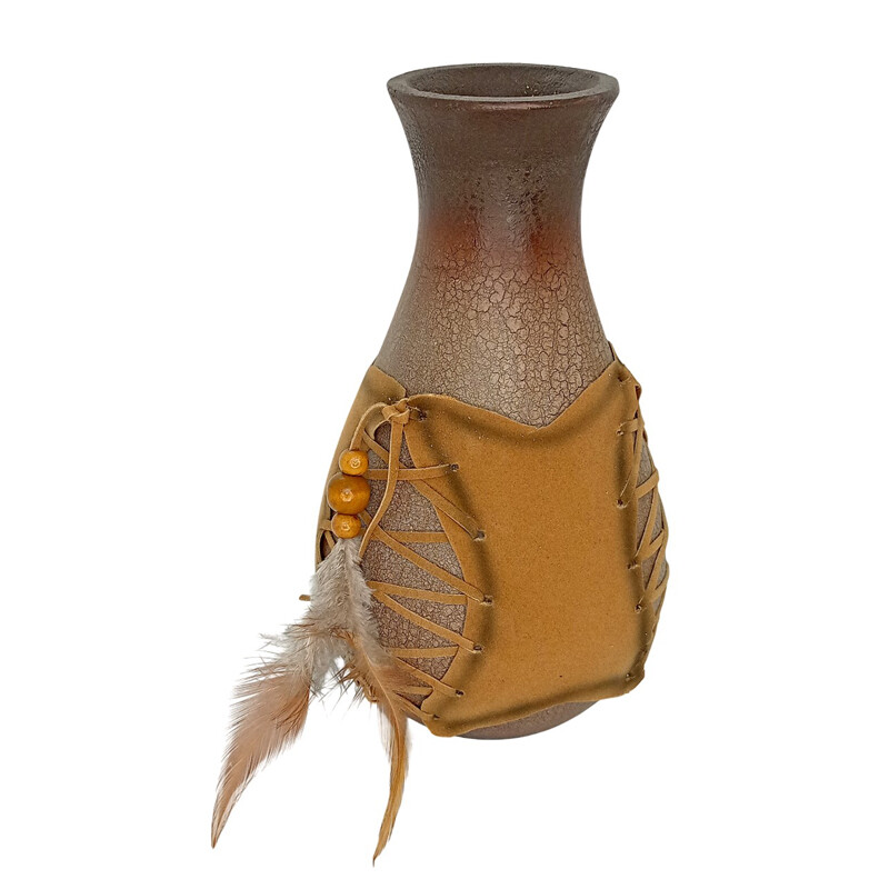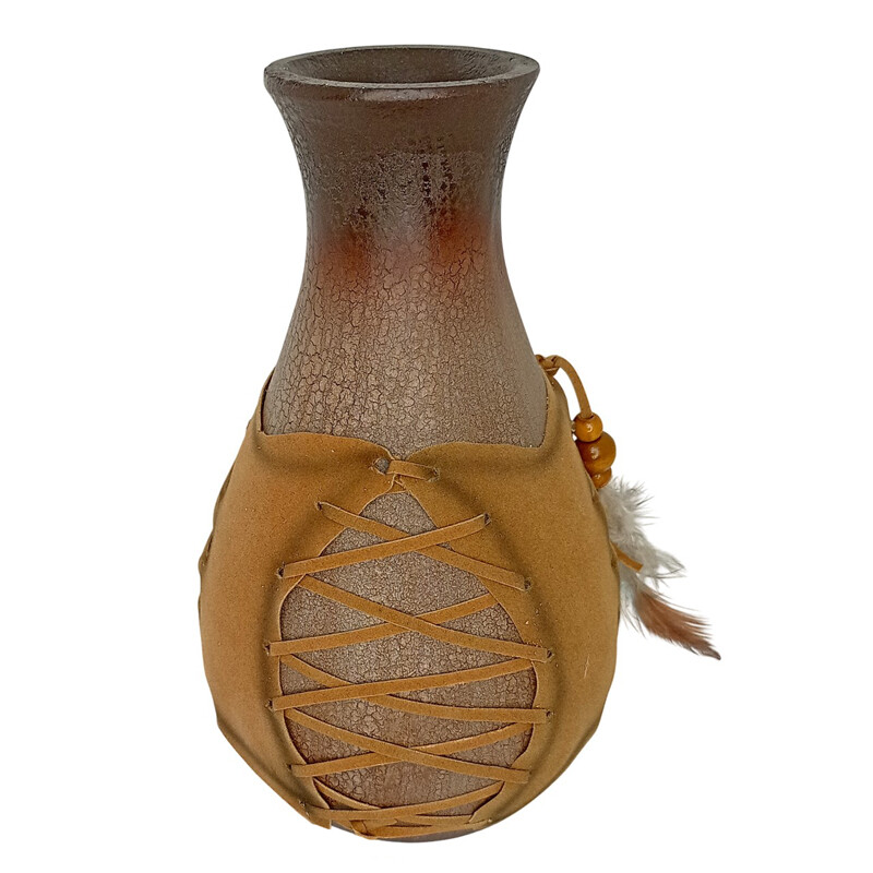 Perusmaljakko yksilöllisin höyhensomistein ja lisäksi maljakko on osin päällystetty ”nahkakaistoilla”, jotka on kiinnitetty nahkanauhoin. Pakattu yksittäin valkoiseen pakkaukseen.