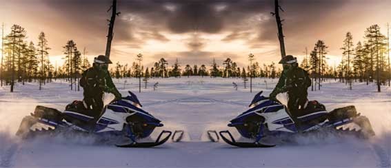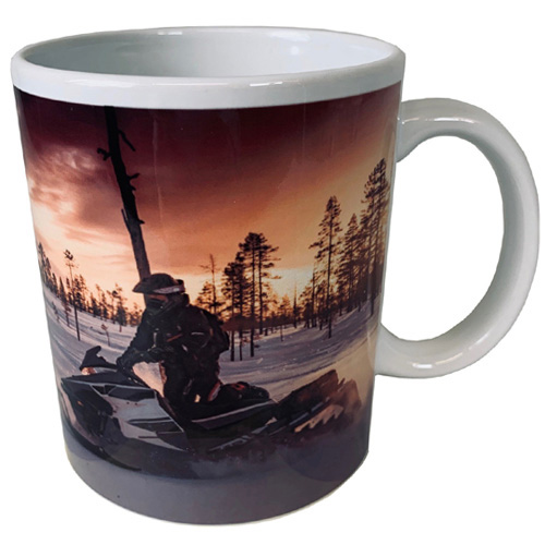 Moottorikelkkailija upeassa talvimaisemassa. Laadukas kuva on mukin molemmilla puolilla.